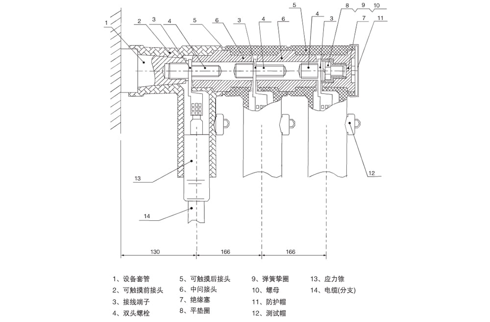 采用進(jìn)口優(yōu)質(zhì)絕緣橡膠全自動(dòng)注射而成,內(nèi)外層均為半導(dǎo)體屏蔽層,內(nèi)層用來均衡內(nèi)部電場(chǎng),外屏蔽層接地保護(hù)電纜頭表面零電位。應(yīng)力錐下端內(nèi)層與電纜的半導(dǎo)體層緊密接觸,而外半導(dǎo)體層又與電纜頭外半導(dǎo)體層緊密接觸,并通過電纜頭的接地孔接地,這樣不僅解決了電纜外屏蔽層切斷處的電場(chǎng)集中問題,而且使電纜外屏蔽層保持零電位,保證人身安全??捎|摸電纜前接頭直接安裝在設(shè)備套管上,其后可與可觸摸電纜后接頭連接,組成多路出線,也可與避雷器連接,為電網(wǎng)提供過電壓保護(hù)。
